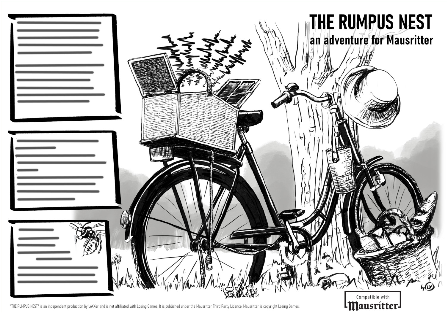 "THE RUMPUS NEST" is an independent production by LeXXer and is not affiliated with Losing Games. It is published under the Mausritter Third Party Licence. Mausritter is copyright Losing Games.